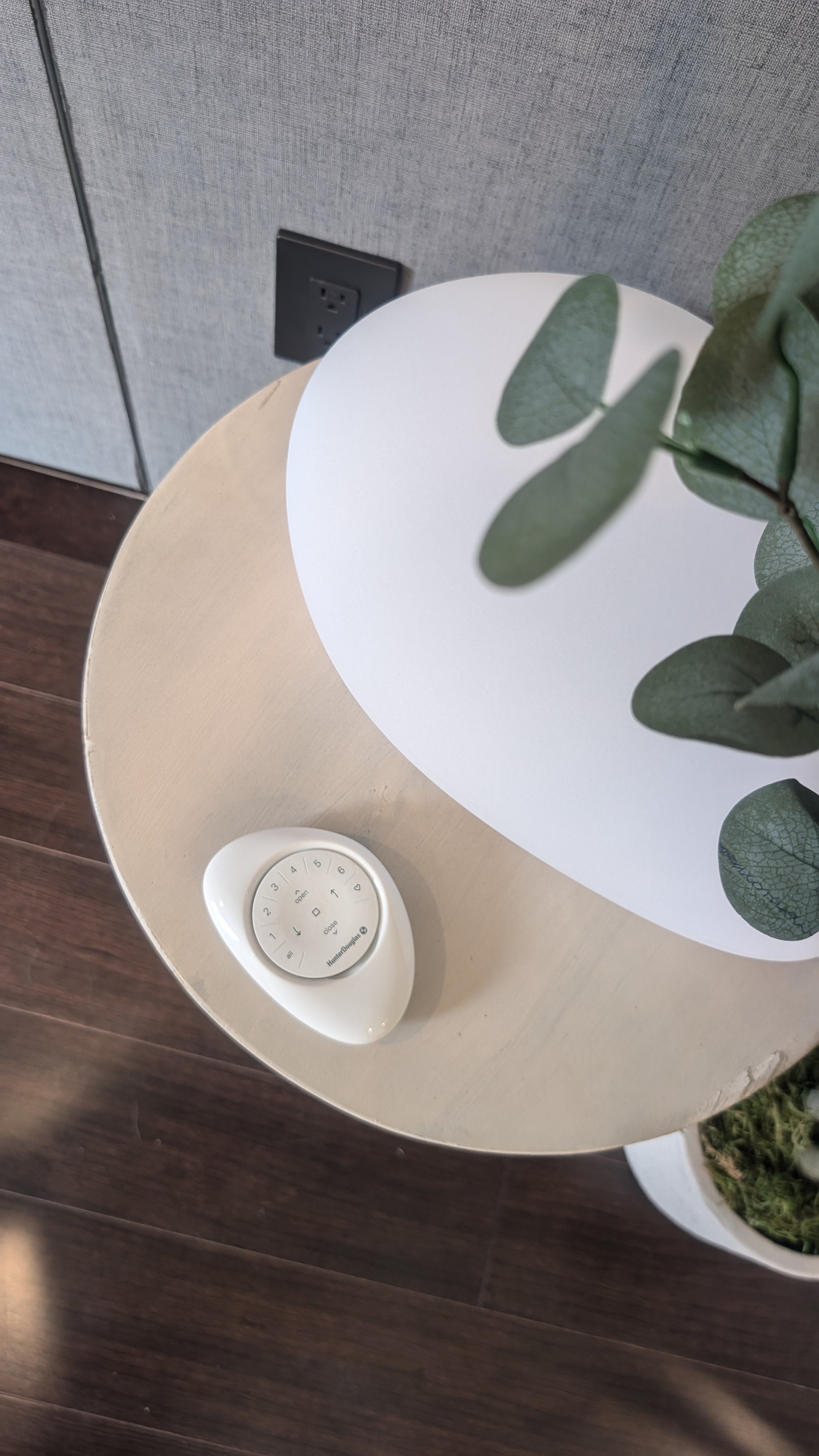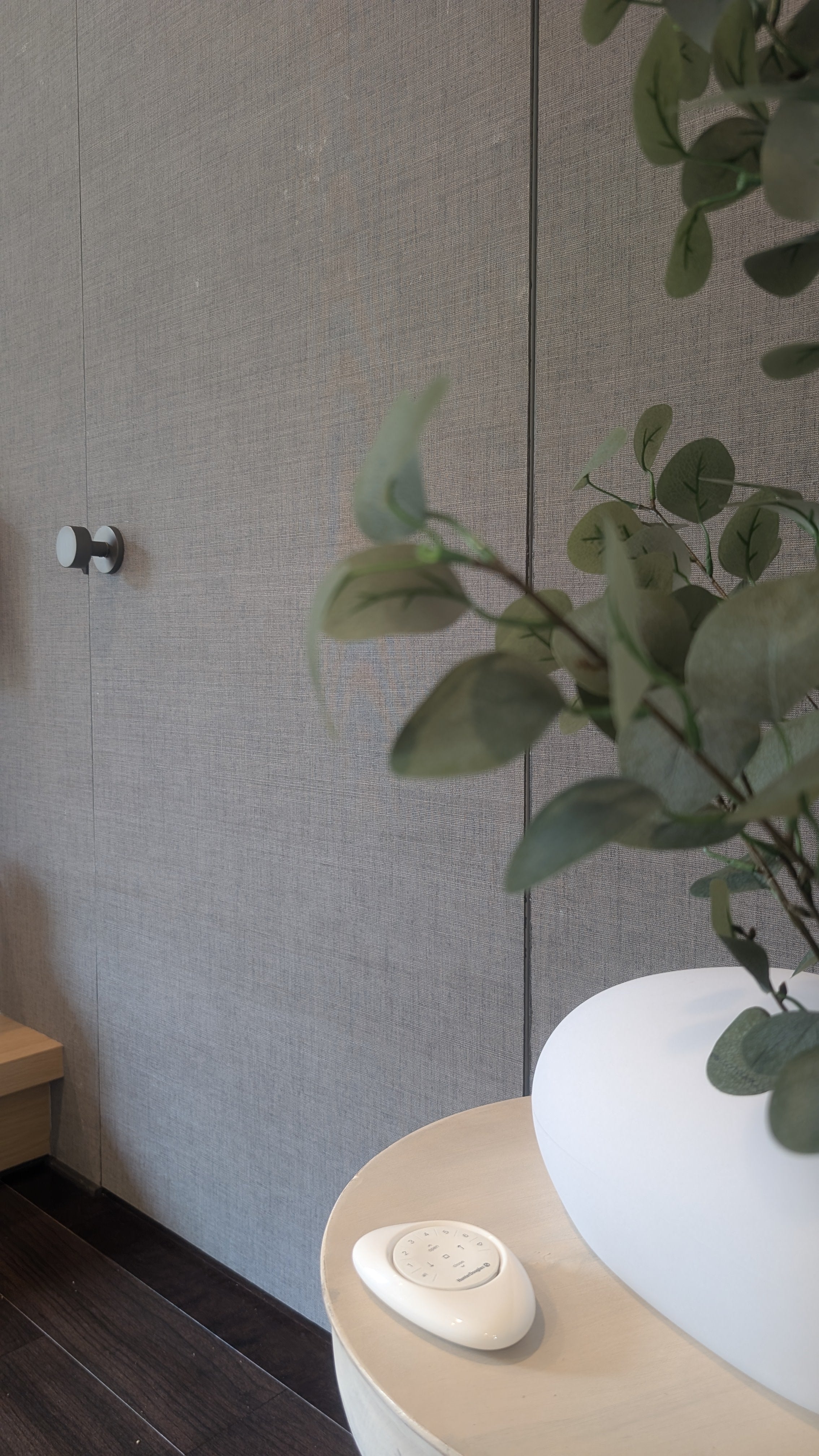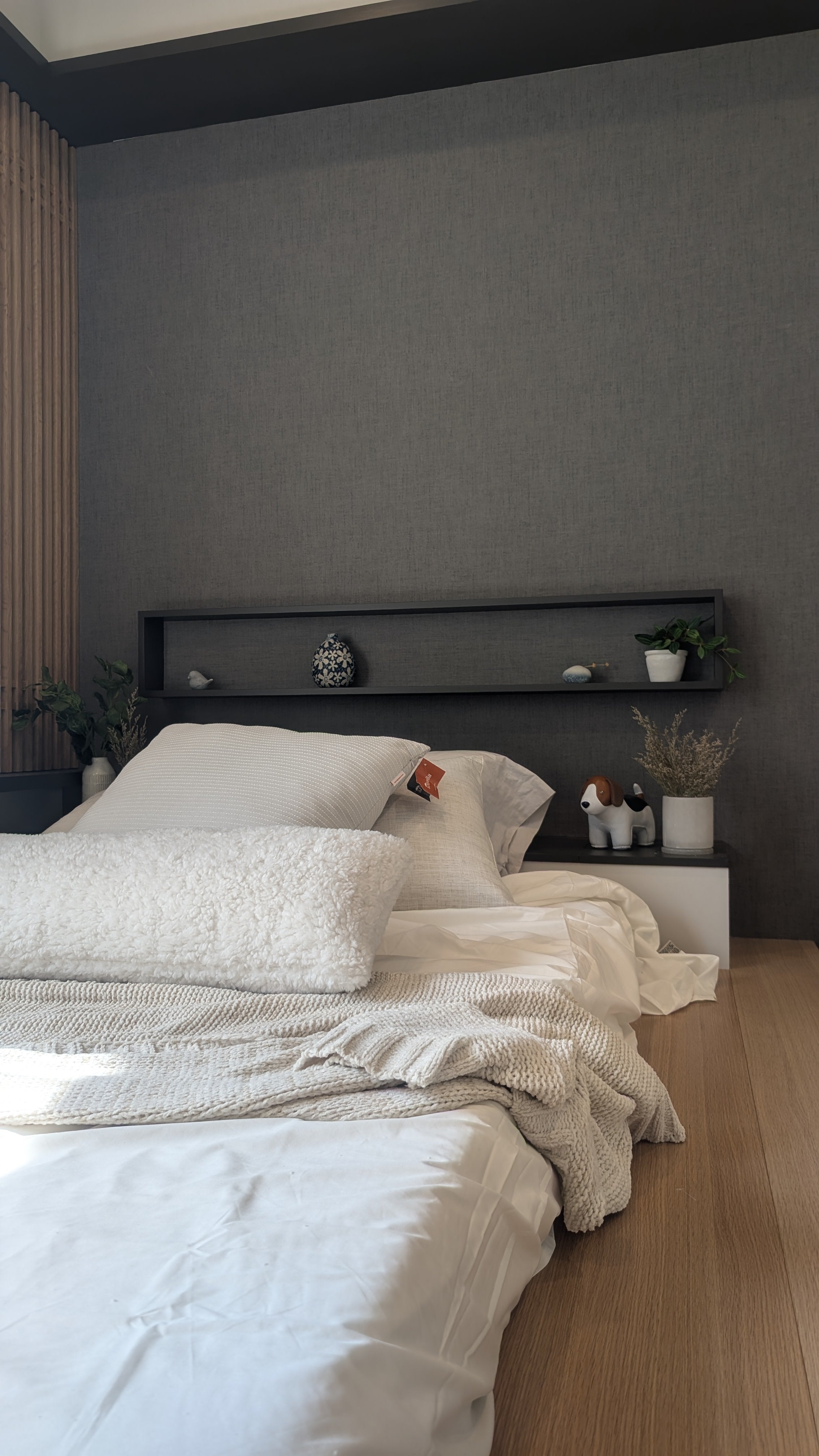 One of the feature walls is a grounded, dark gray wallpaper wall. Contrasting the gray, we added the wooden slats perpendicular to the feature to allow the eyes to focus on the most restful corner in the room.