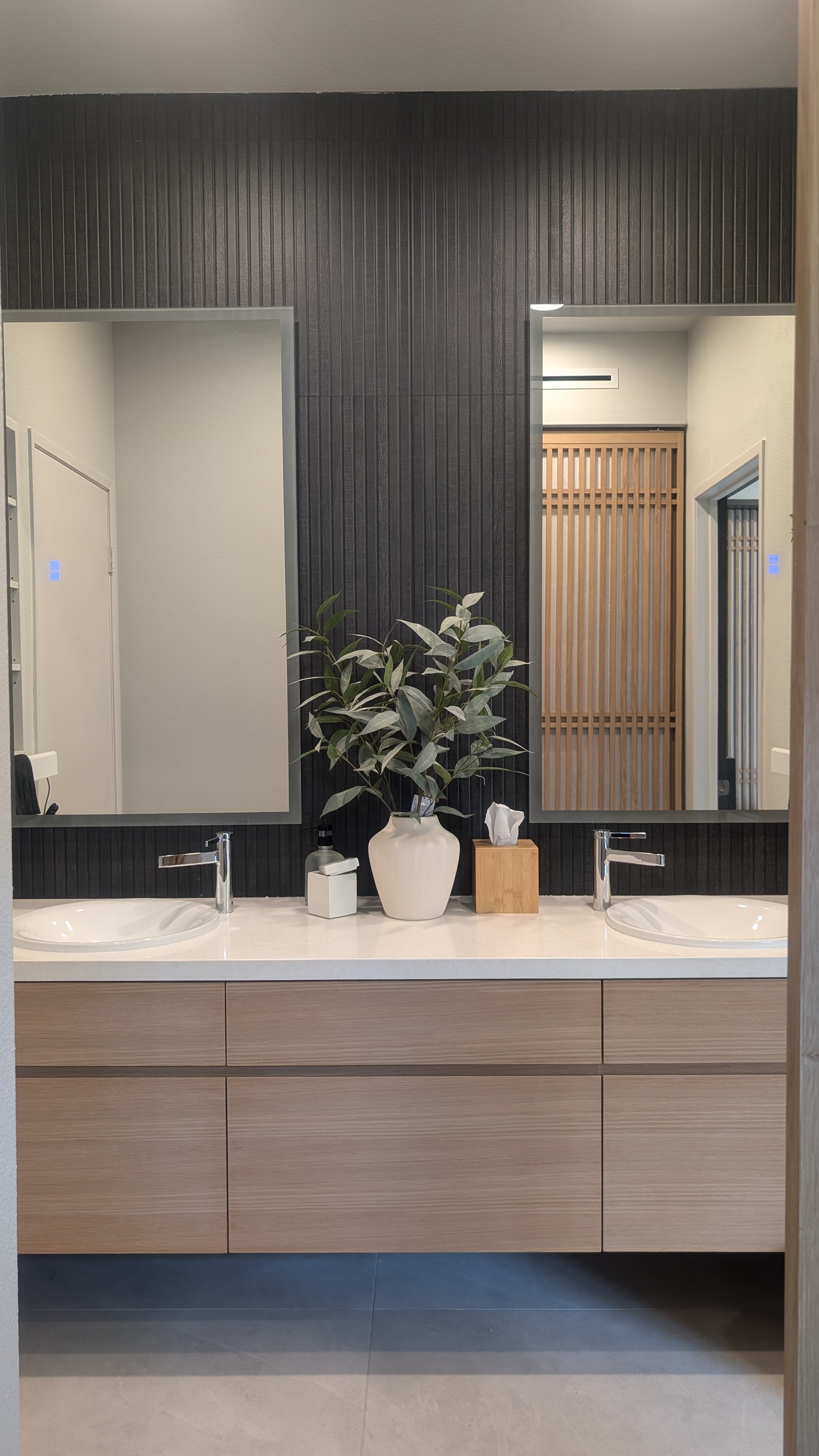 The bathroom also uses the same duality contrast, with the black slated tile as an accent wall, and the white oak custom built vanity, polished chrome and mixed metal white finishes to balance them off.