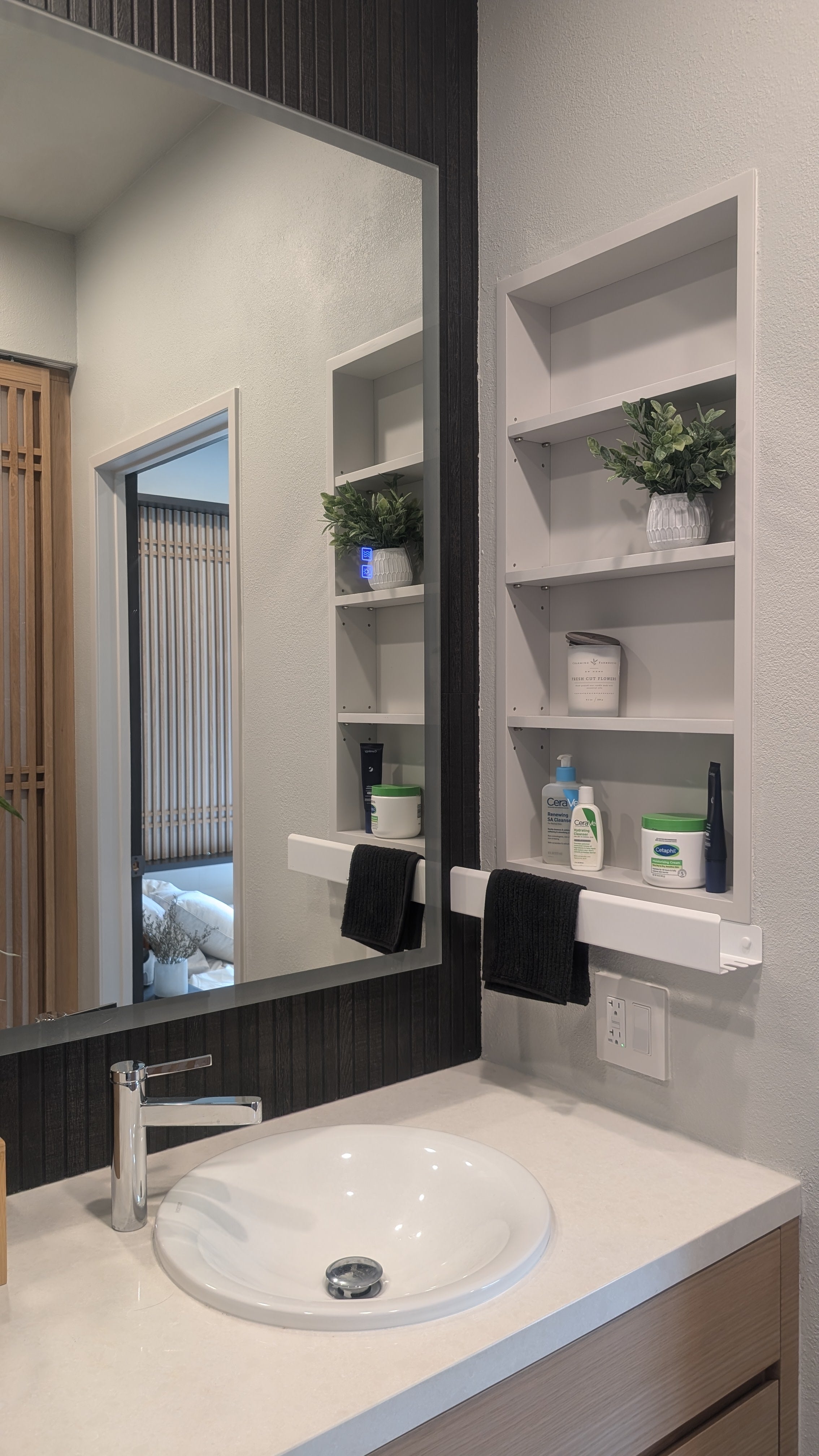 In front of the vanity sits a partition of custom built cabinet with sliding door, giving privacy to the toiletry and bathing section from the vanity.