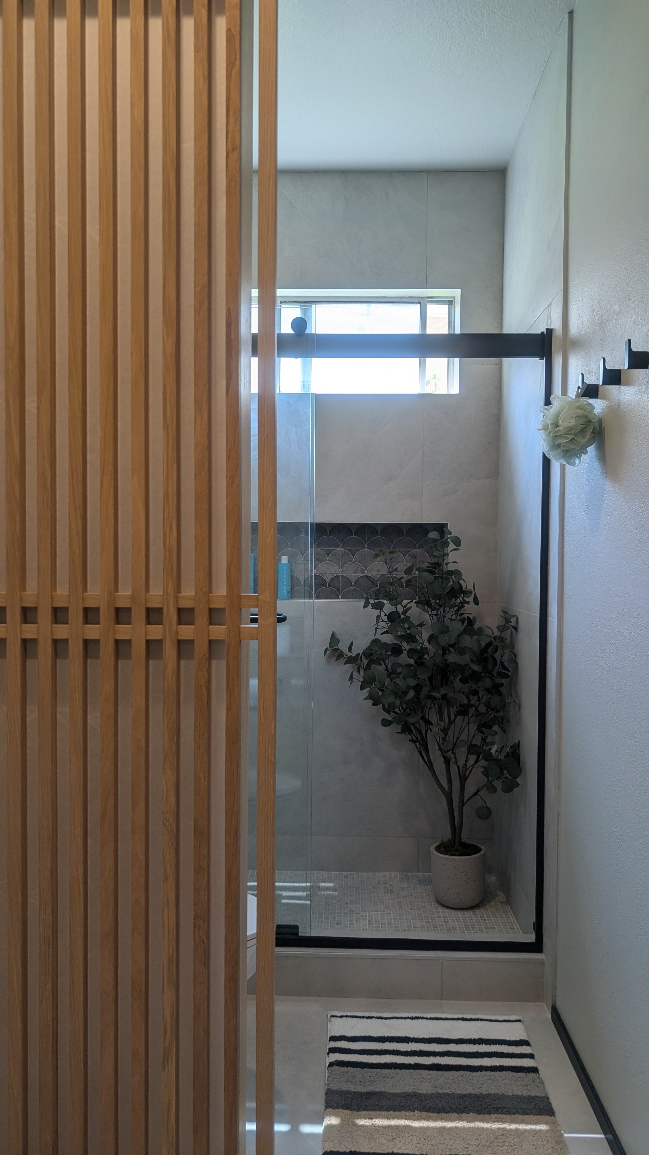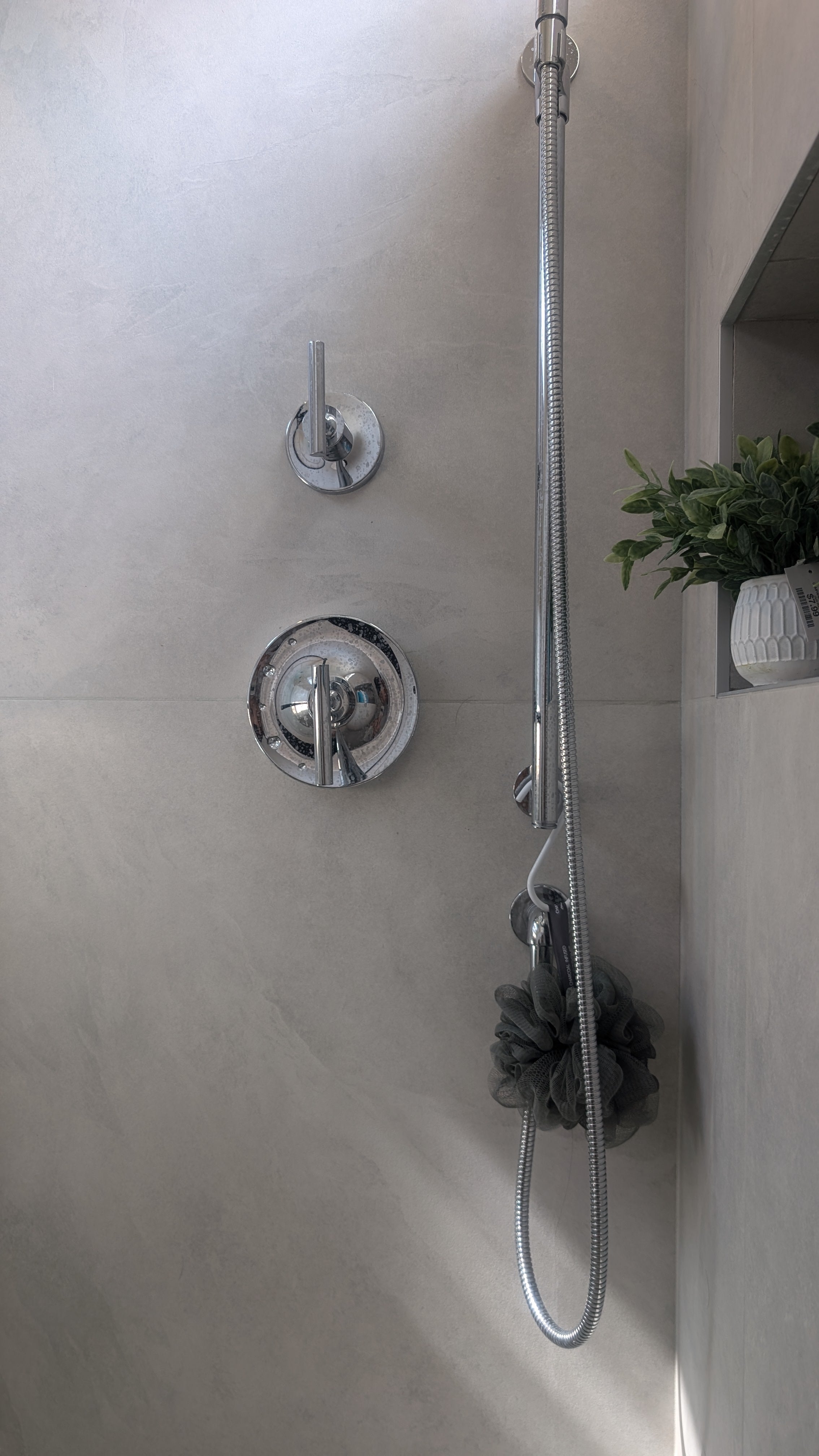To give that natural combo look of wood and stone, a neutral gray large porcelain slab was selected as both the main flooring and main shower tiling.