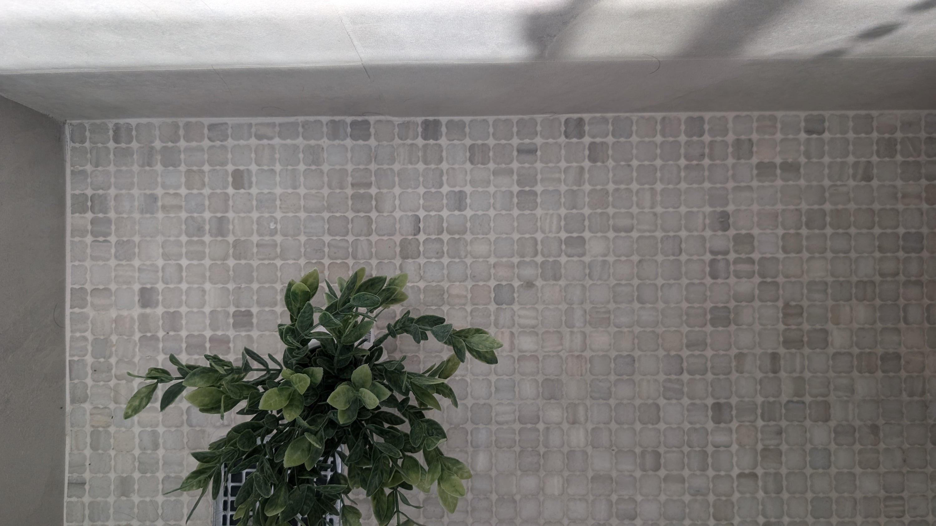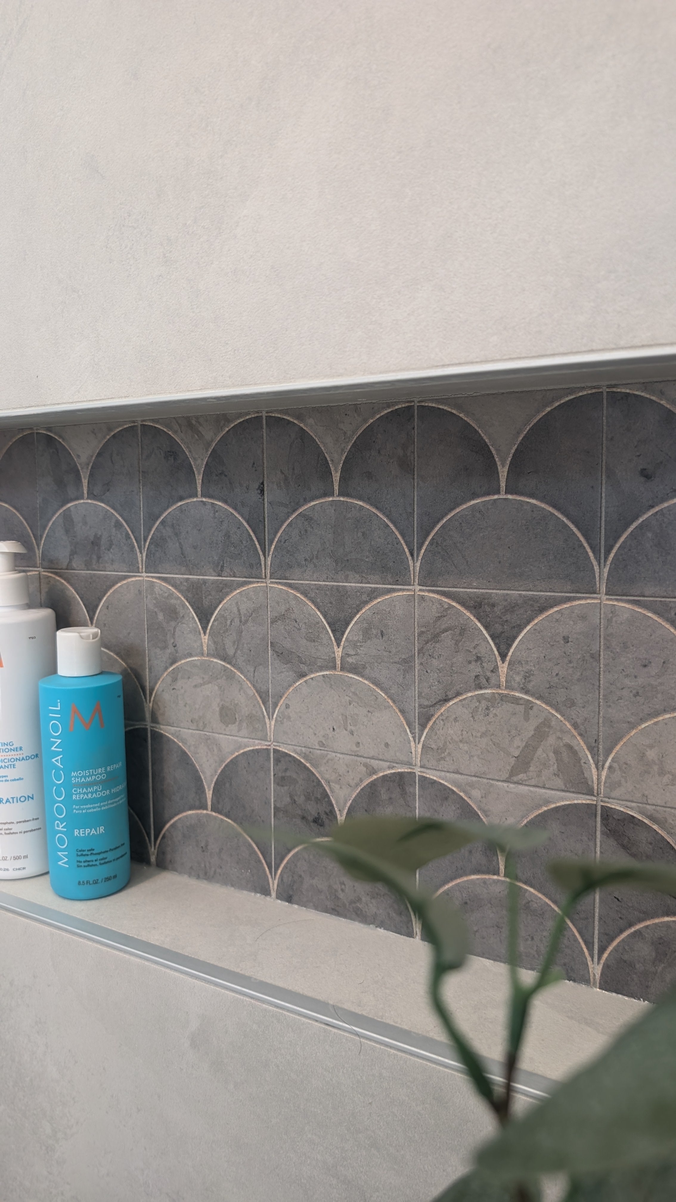 Mosaic clover tile was selected to add a layer of sophistication to the shower floor, while selecting a hand painted Limestone tile as a main feature patterning in the shower niche area.