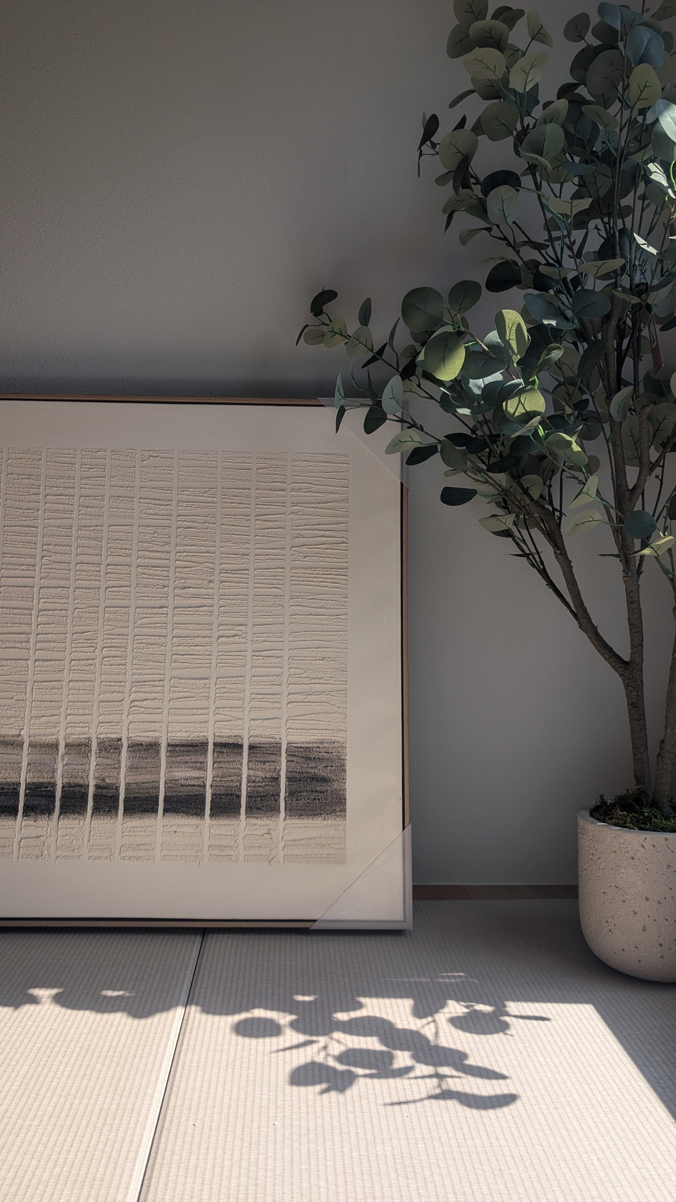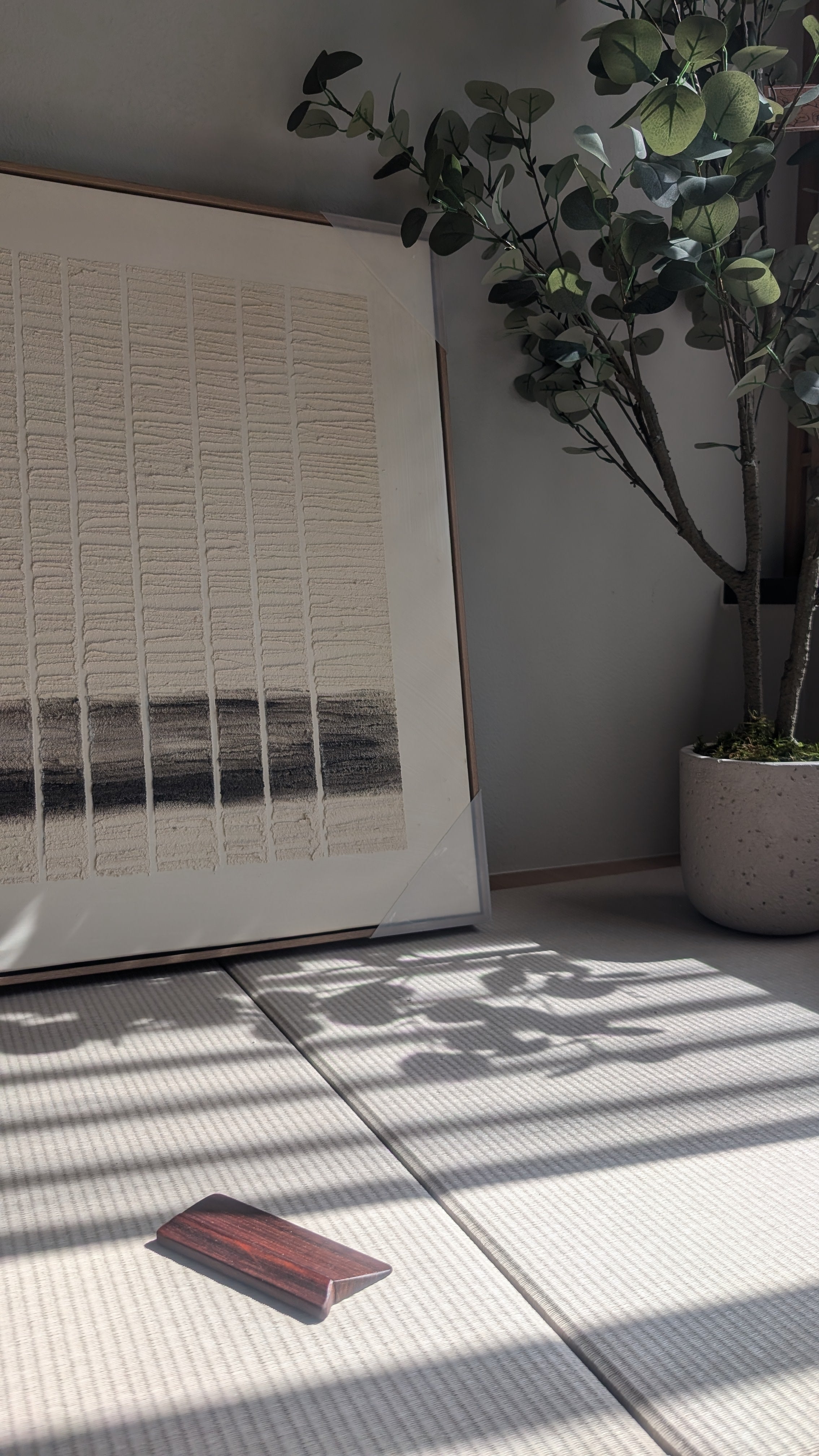 A serene retreat with a duality of grounded and airy elements in a modern Japanese bedroom.