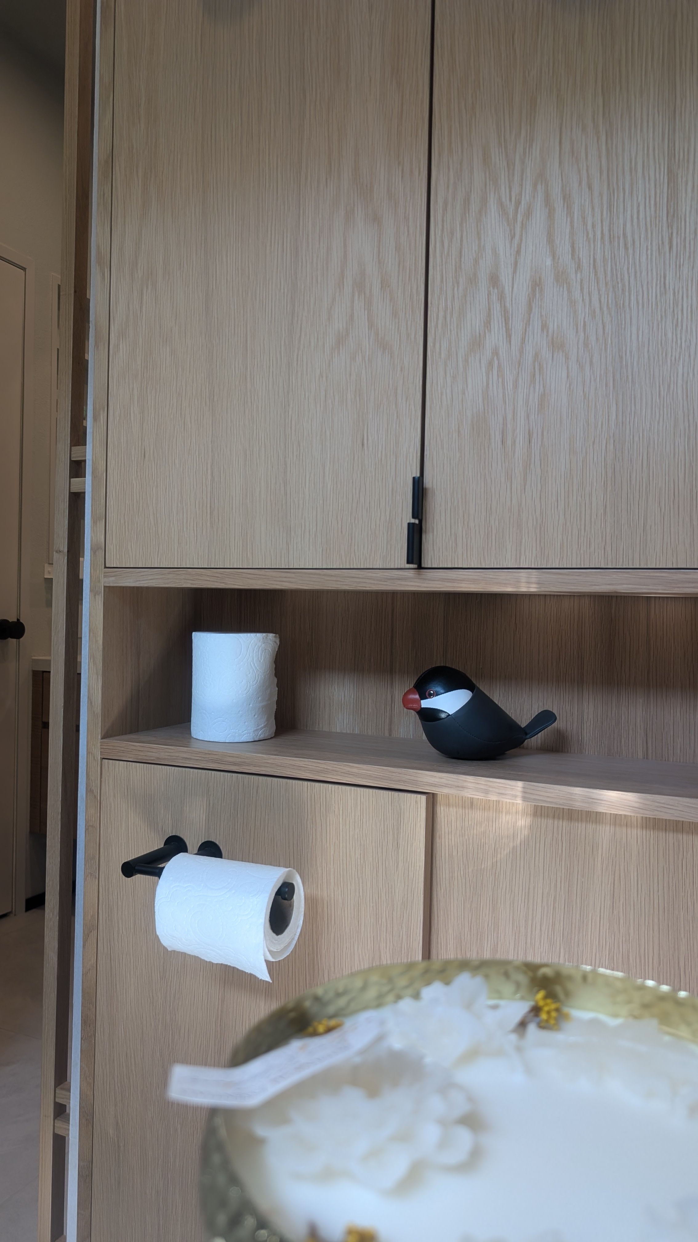 The partition wall also serves as a hidden storage, for storing toiletries and a toiletry holder that also acts as a sliding door handle when used.