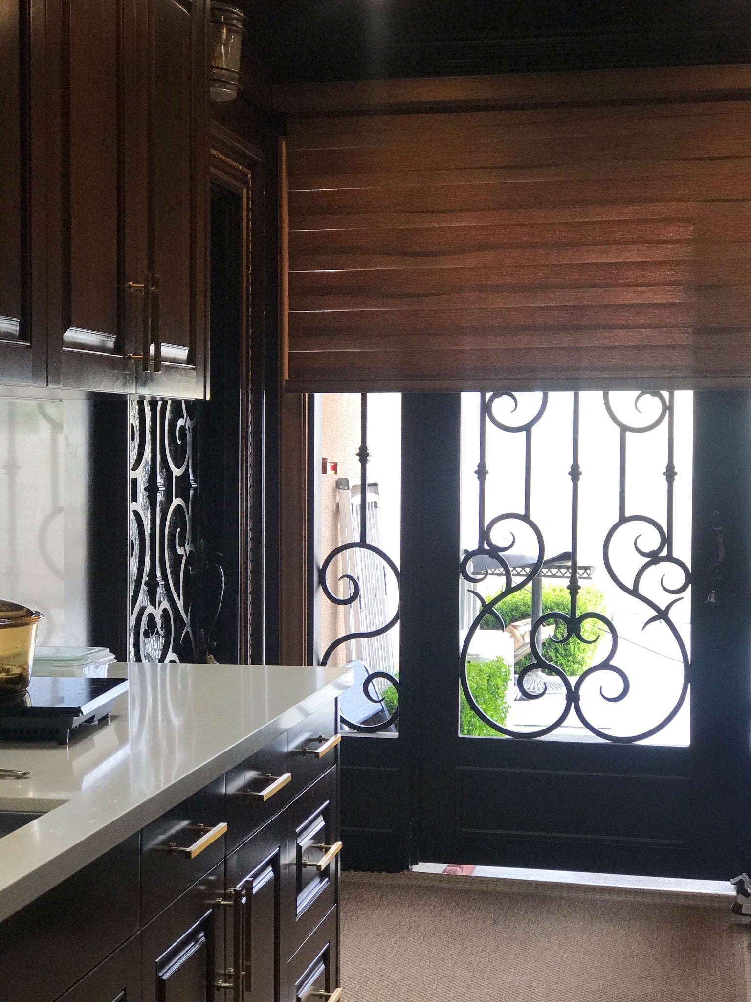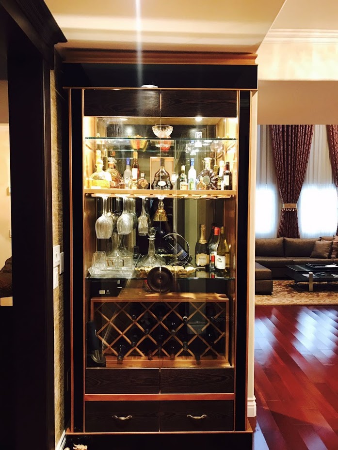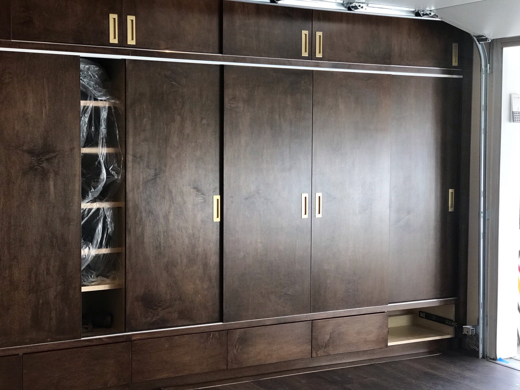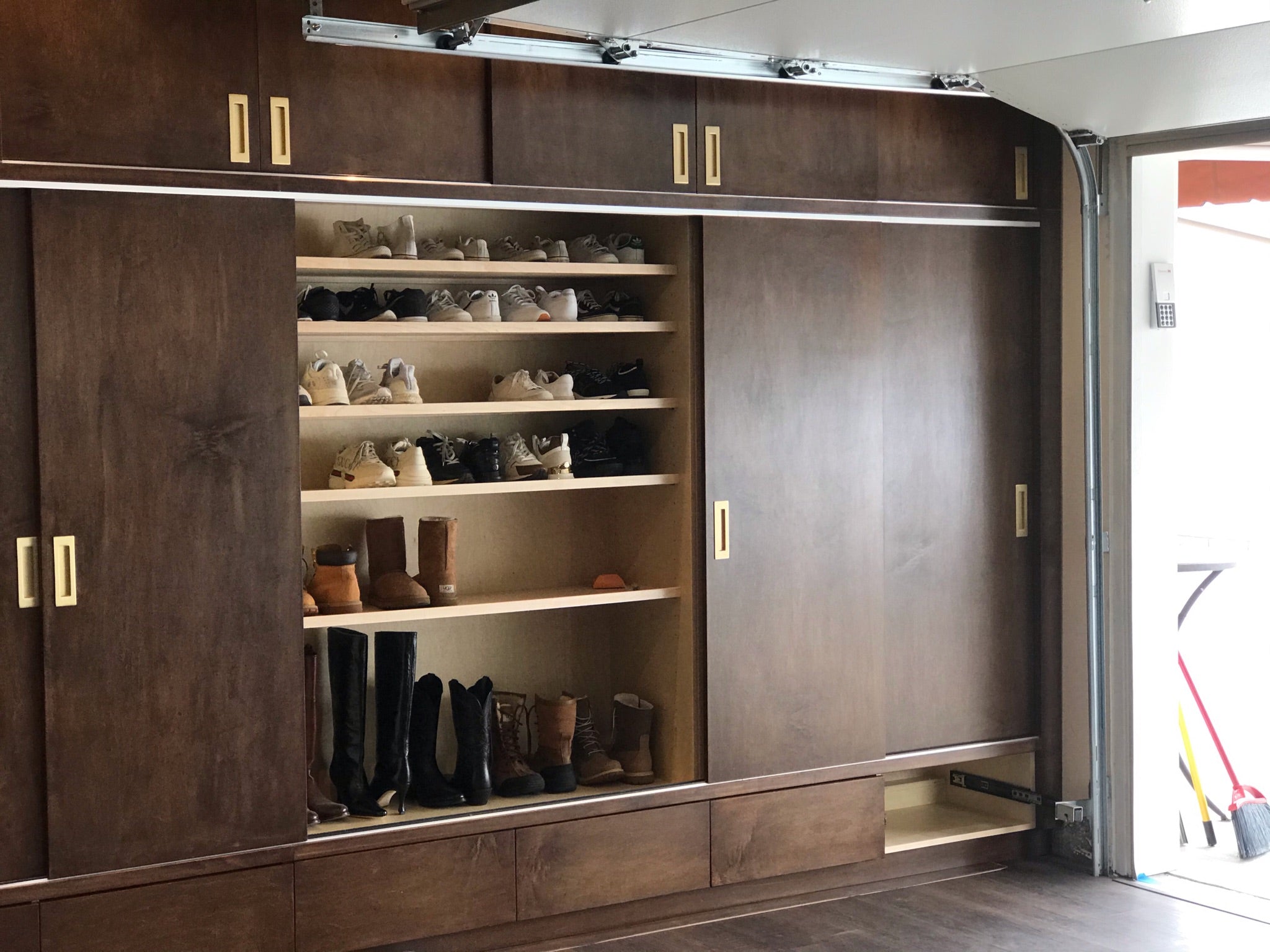 A portion of the garage is built to contain shoe storages for our advent shoe collector. Furnished in walnut and accented with gold pulls.