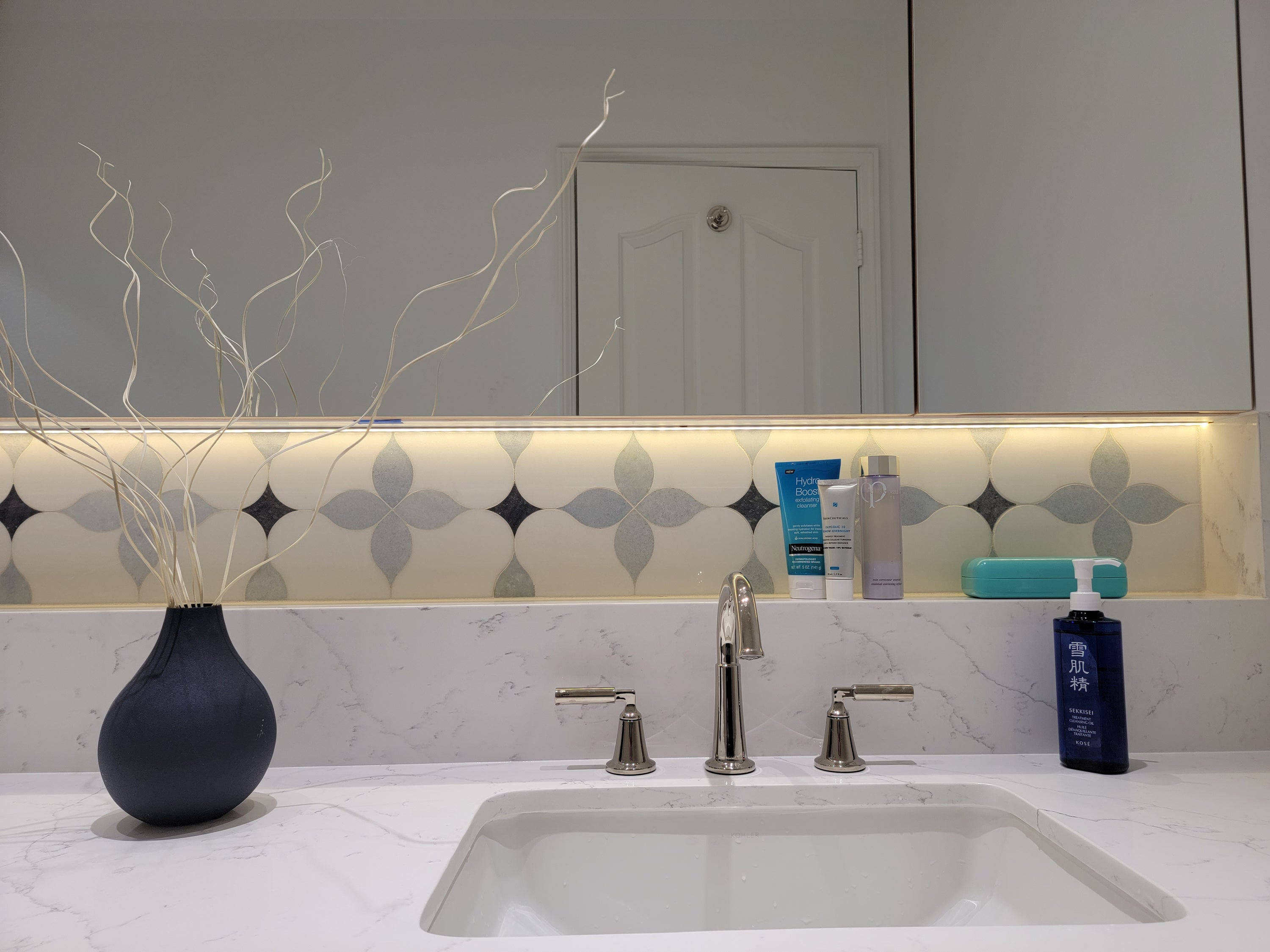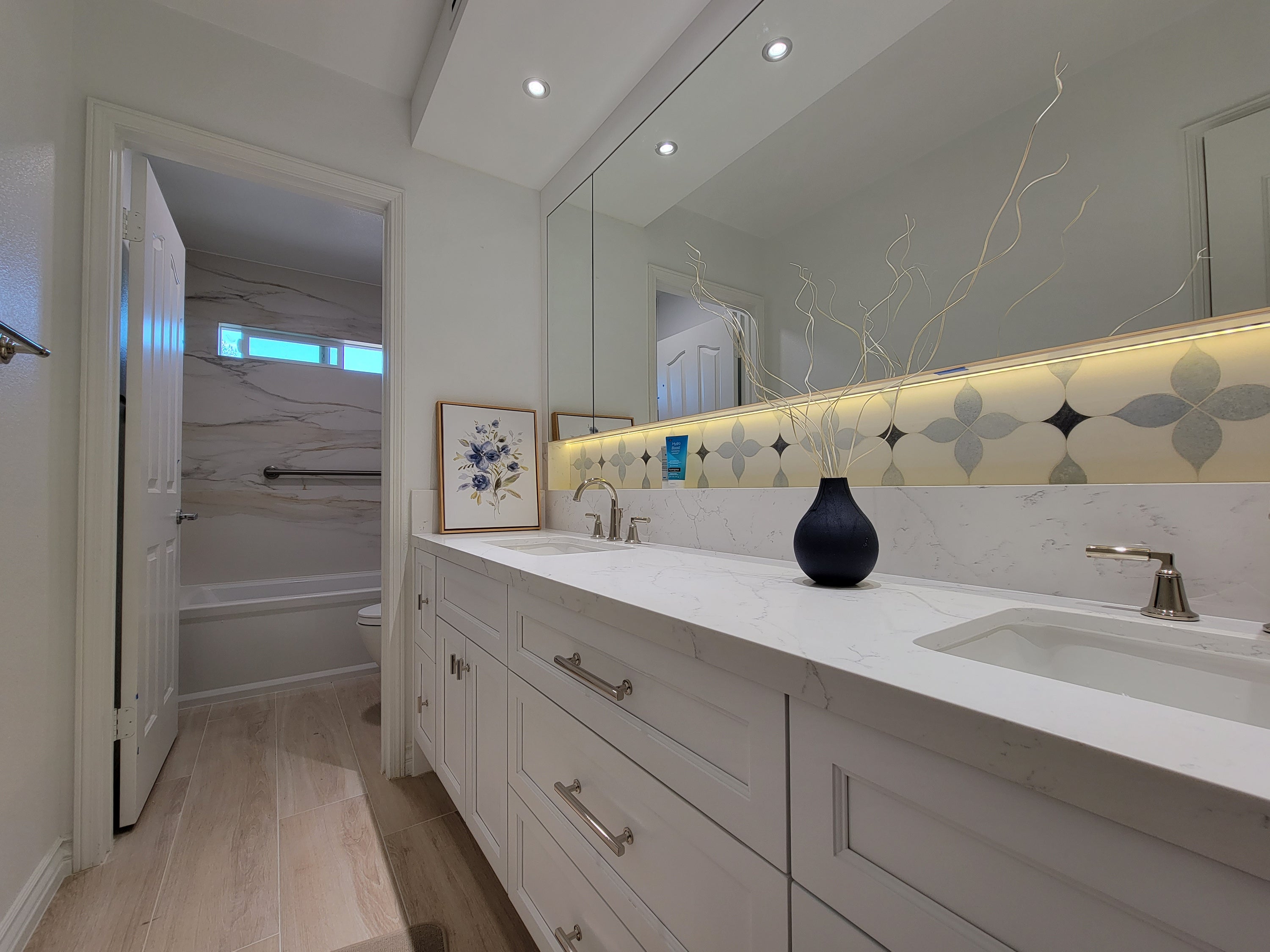 Mirrors that span across the entire length doubles the space, while also enclosing additional storage spaces for each user.