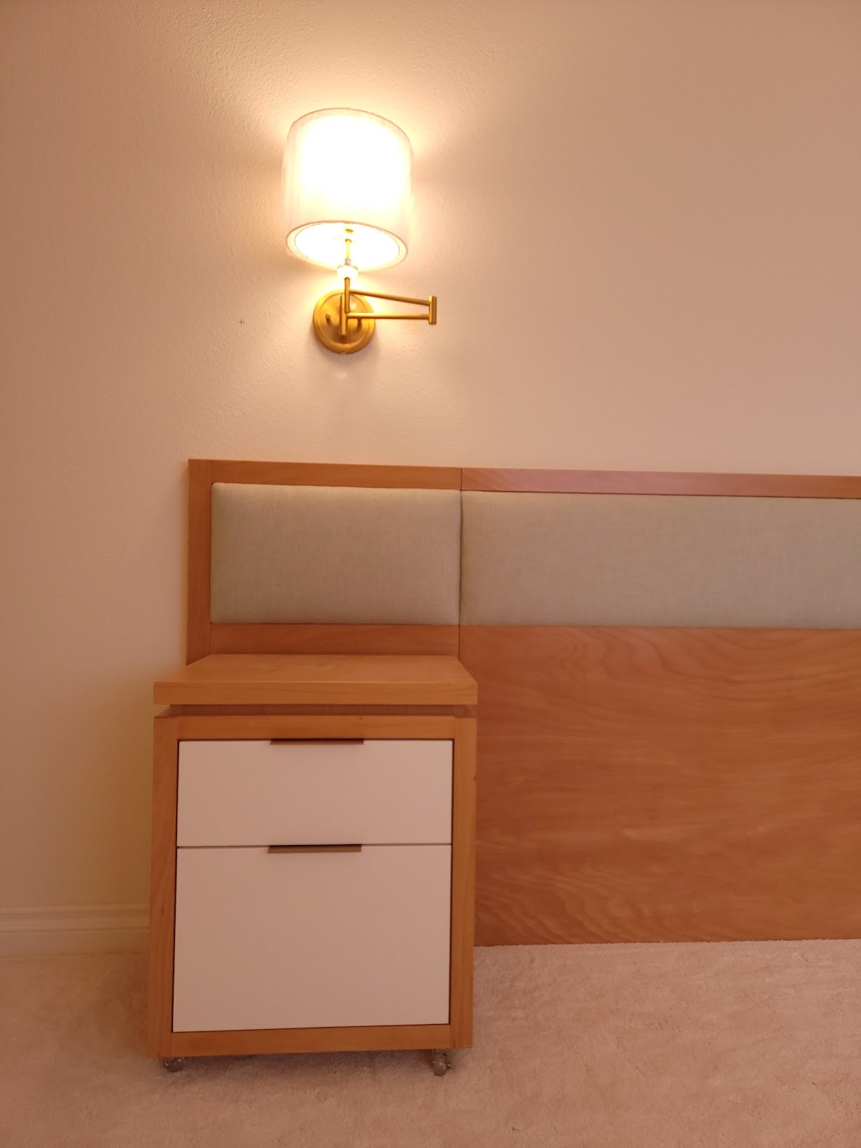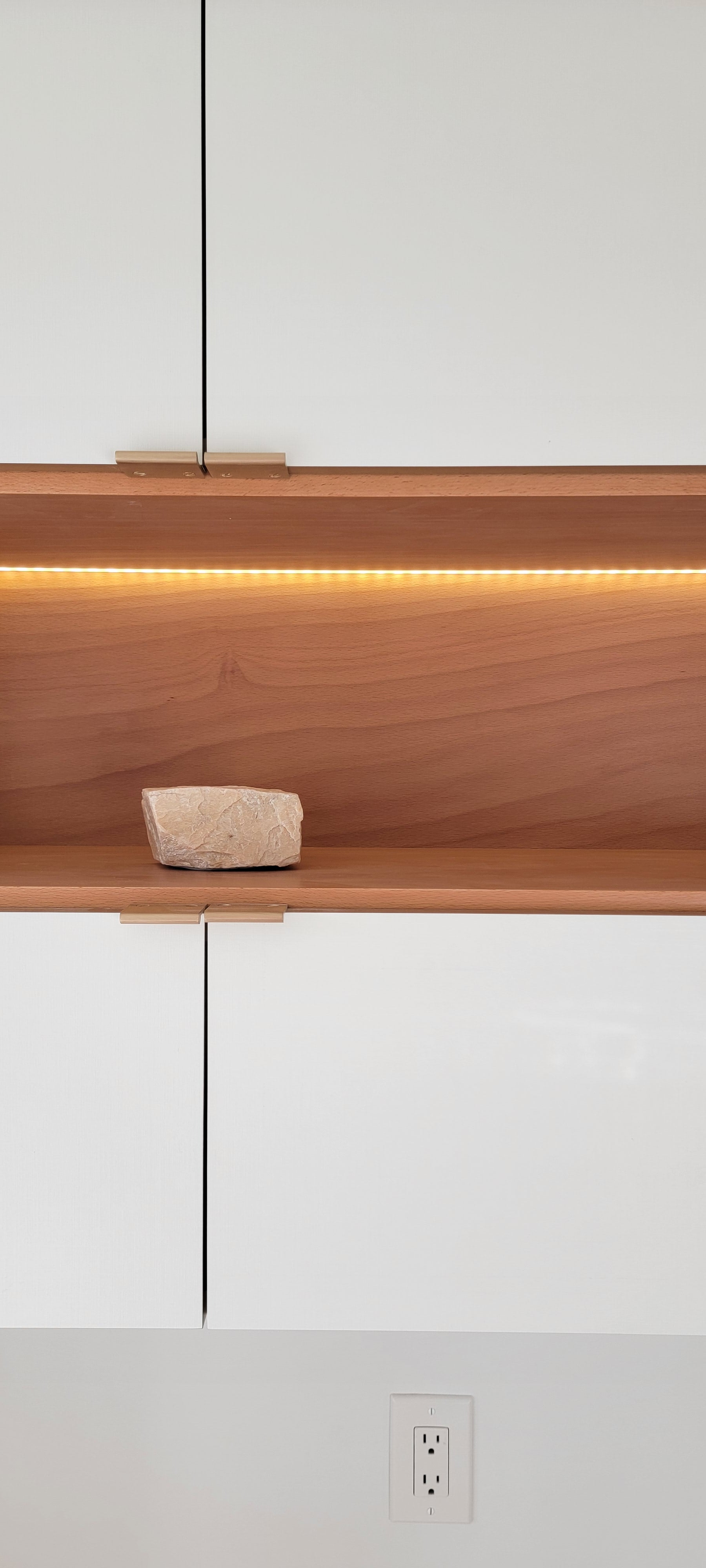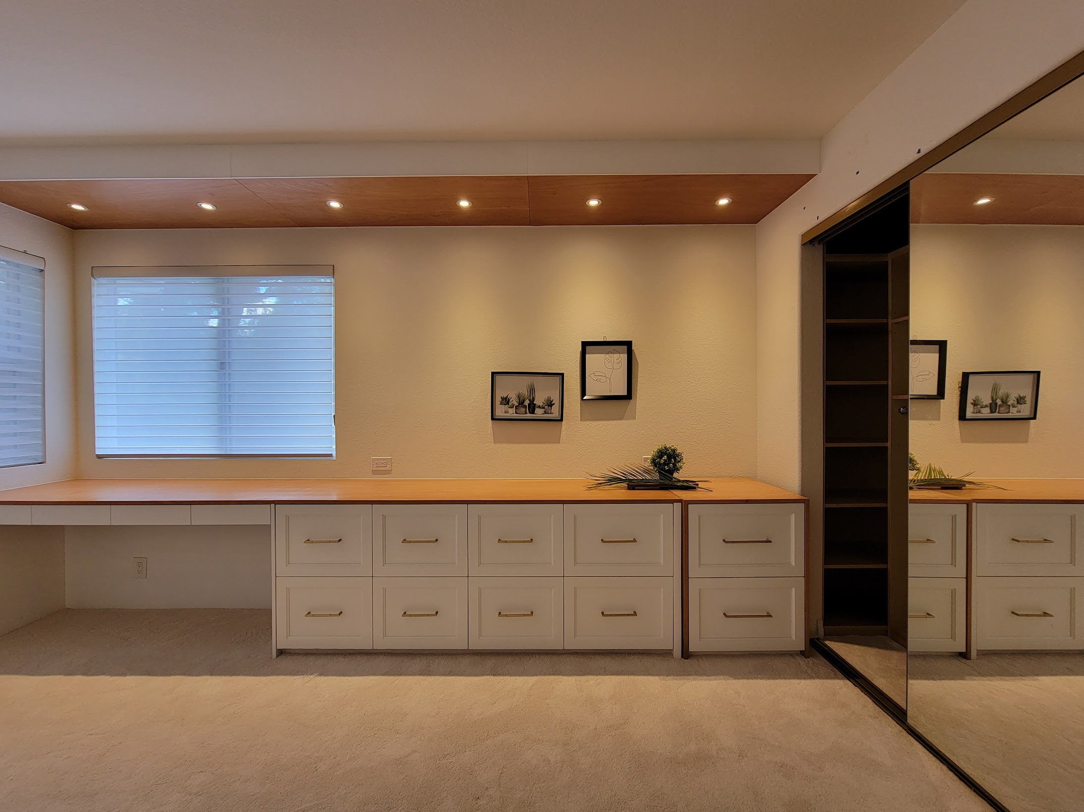 Each of the bedroom contains custom built desks that doubles as storage spaces. Spanning from wall to wall, the desks are furnished with a rich Beech wood tone that warms up the bedroom areas. Mirroring that warmth, the ceiling is also dropped to mirror that same wood tone.