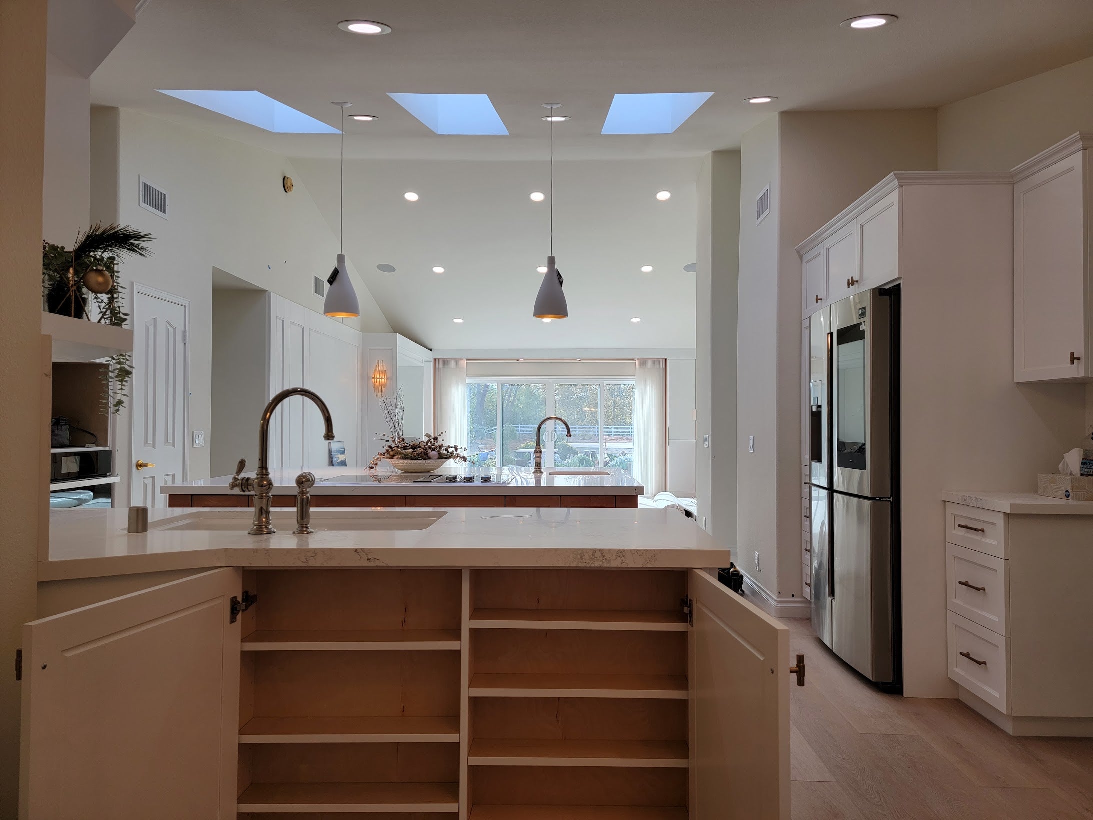Using the island as the focal point, the view extends from the central location of the kitchen all the way to the beautiful backyard as a background. Storage spaces are doubled to the front, back and sides of individual cabinet units.