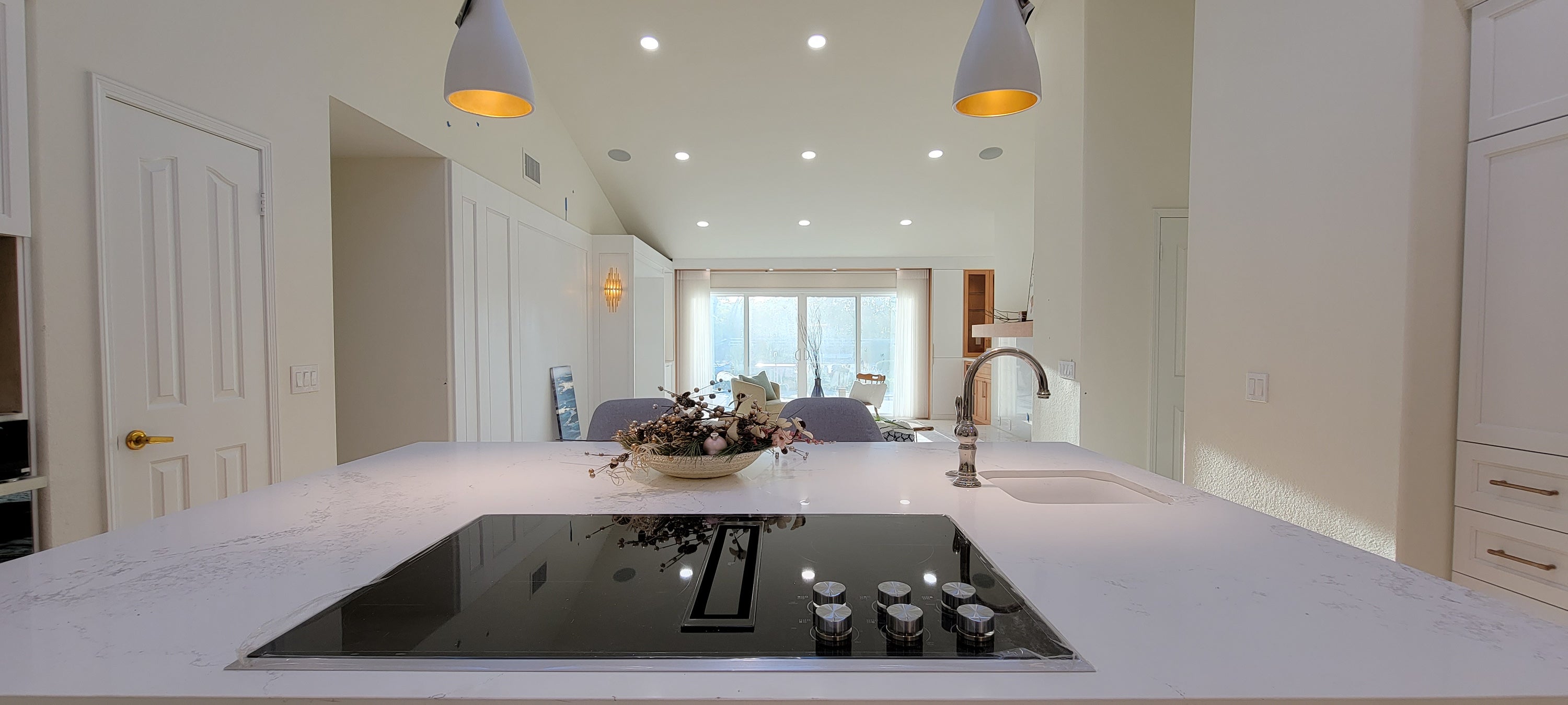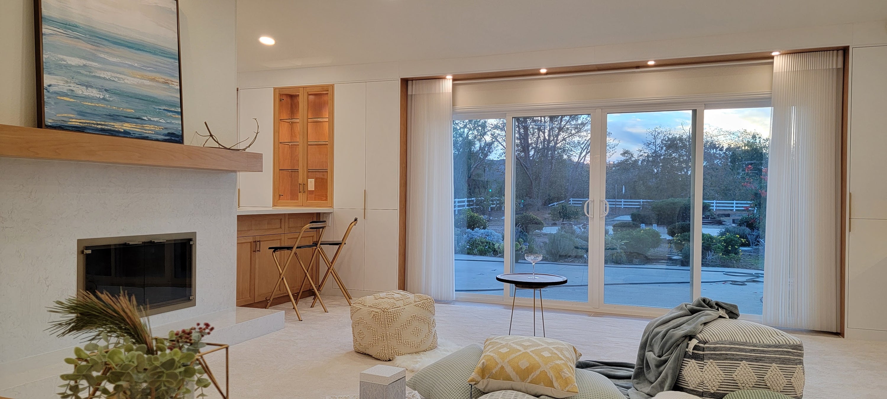 Situated in between the two living room areas is the wet bar, where it masterfully blends and accentuates the next space by providing a window view through the areas.
