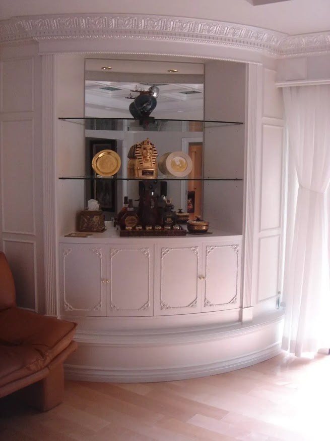 One of our earliest works, we turned an existing fireplace into an embellished pearl white display cabinet that merges with the walls- styled with traditional European crowns, base and caps.